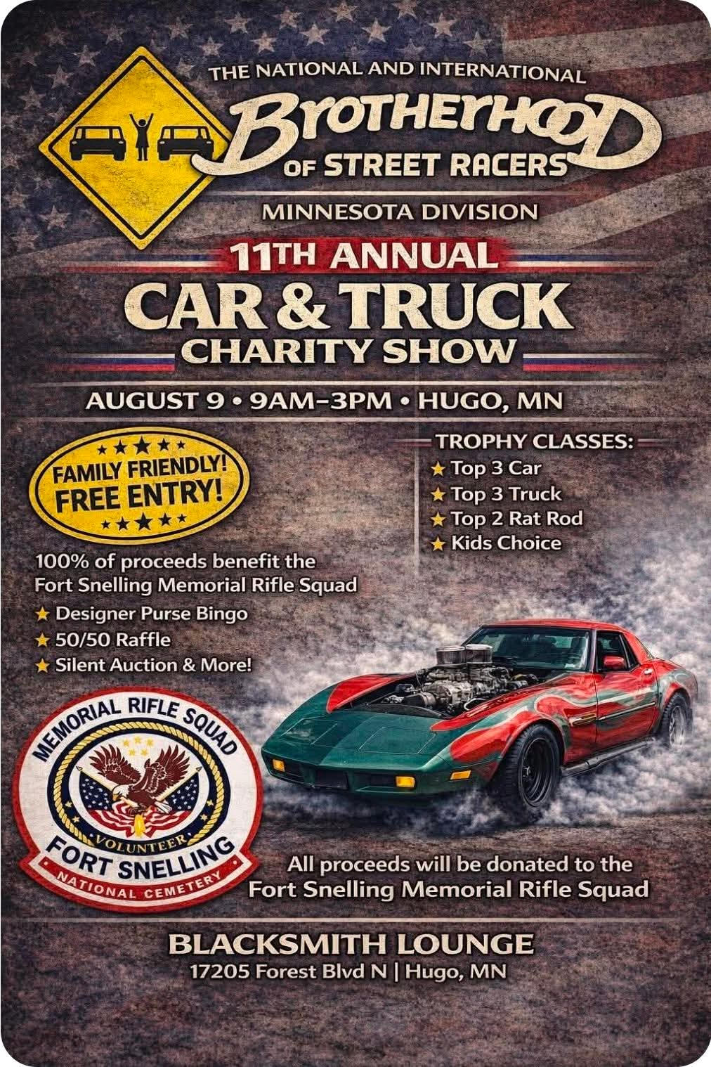 Free Entry! Free will donations to the Fort Snelling Memorial Rifle Squad. Family friendly event that has something for everyone! Car Show, Silent Auction, Coach Purse Bingo, Vendors, Kid Activities, Awards and OTHER CONTESTS! 100% of the money raised will be donated! MRS is incredibly special to our community because they are made up completely by Veteran volunteers. They perform funerals for fellow veterans at no cost to their families. They honor the Veteran with a color guard, rifle volley, the folding and presentation of our flag and a live bugler playing “taps”.